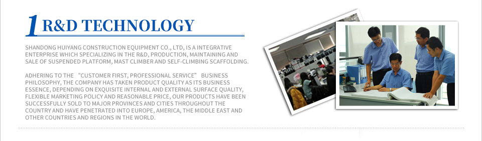 Shandong Huiyang Construction Equipment Co., Ltd, established in 2005, covers 43,000 sauare meters, located at Dezhou?City, is professional in the R&D, production and sales of Suspended Platform, Mast Climber, Self-climbing Scaffolding on hight operation.?