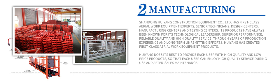 Now Huiyang becomes the production base and research centre of exporting Suspended Platform, Mast Clmber, Self-climbing Scaffolding in China. With CE Certificate, CCC AND iso9001-2015, the quality of our product is in the first-class in China and our products have been exported to more?than 20 countries, which can be comparable with European famous suspended platforms.